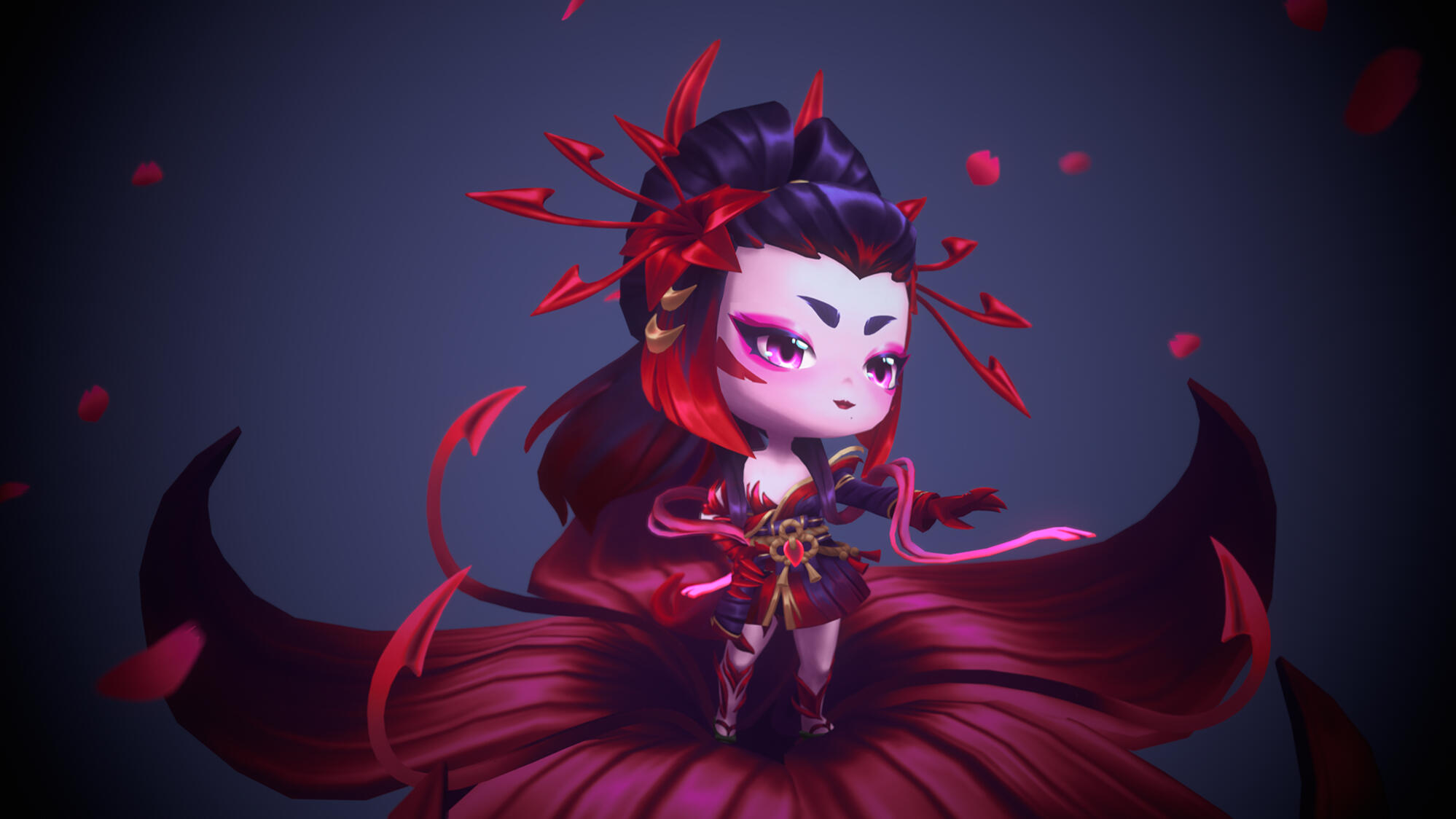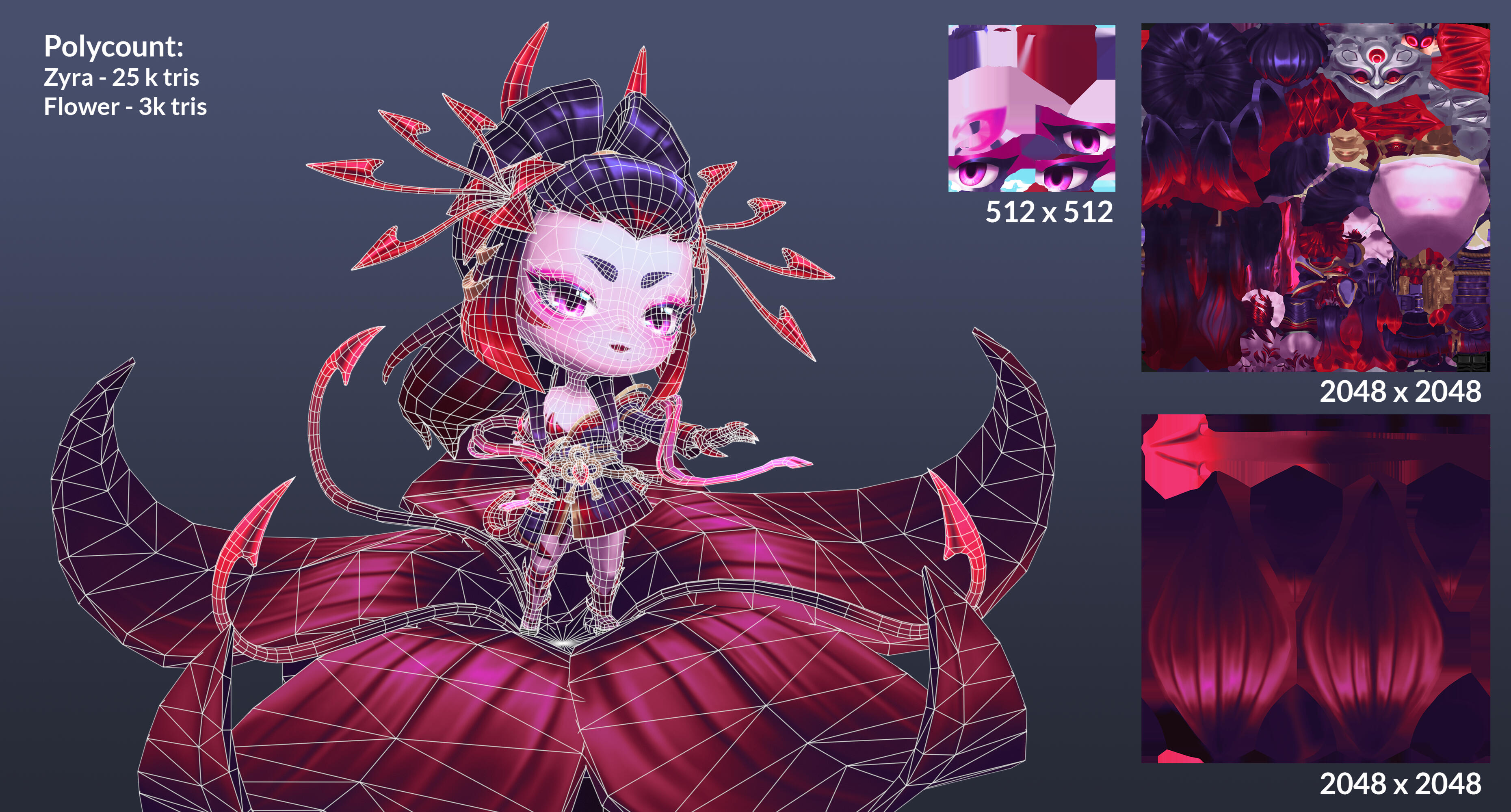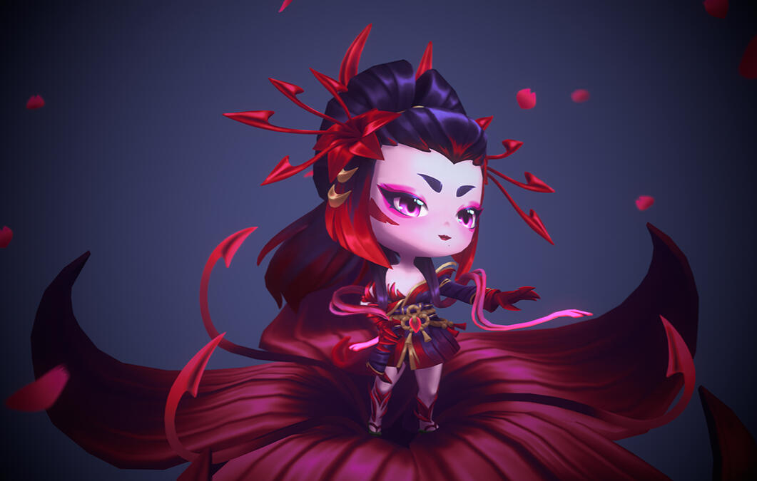 I had a lot of fun studying the TFT style and working on a cuter, chibi style for the first time. For this project, I wanted to practice greyscale hand-painting, so I did a full render in grayscale before applying colors at the very end. The biggest challenge for me was achieving Zyra’s red and purple gradients using greyscale.
