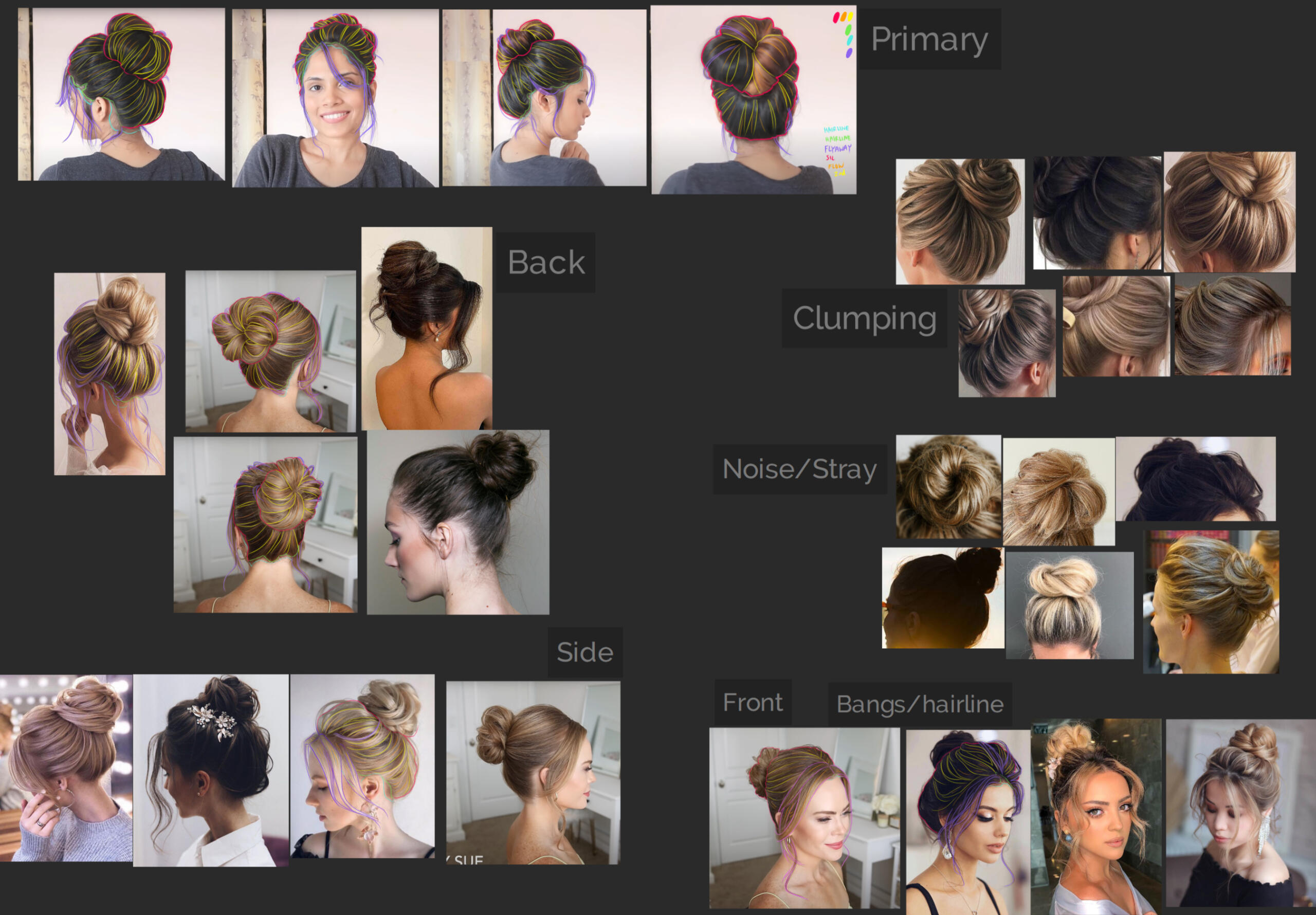 To research the high bun hairstyle, I first found references. To study them, I did a draw over to identify the silhouette, flow, clumping, hairline location, and strays. Doing so helped me identify some key features for the sculpt pass to make it look like a casual high bun that has become a bit messy after a day’s events.